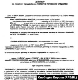 Това става ясно от копие на договора за покупко-продажба на автомобила, с което Свободна Европа разполага. Сделката е извършена на силно занижена цена като според Илия Златанов към онзи момент пикапът не е струвал по-малко от 50 000 лв.