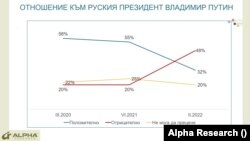 Отношението на българите към Владимир Путин и Русия се е променило рязко заради войната, която той води в Украйна. Това сочи проучване на „Алфа Рисърч“, направено за БНТ, което е направено на 4-тия ден от инвазията – 28 февруари сред 500 души от цялата страна.