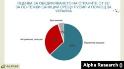 63% от запитаните оценяват като правилна политика безпрецедентното обединение на европейските страни в налагането на единни санкции срещу Русия и помощ за Украйна. На обратното мнение са 32 на сто.