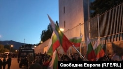 По целия път до руското посолство протестът преминава мирно. Когато достигат крайната си точка обаче, участниците са посрещнати от руска музика и десетки полицаи. Оказва се, че униформените пазят не само входа на посолството, но и десетина души, които организират собствена, алтернативна демонстрация пред сградата.