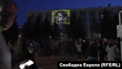 През това време протестиращите срещу руската агресия осветяват руското посолство в жълто и синьо - цветовете на украинския флаг. Малко след това на фасадата се появява и образът на Путин, смесен с този на Хитлер.