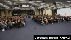 При появяването на Костов, залата се изправи на крака и всички го аплодираха. Усмихнат и в добро настроение, той се ръкува с най-близките си сподвижници.