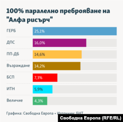 Според паралелното преброяване на 100% от бюлетините от "Алфа Рисърч", цитирано от БНТ, разпределението на гласовете е следното: